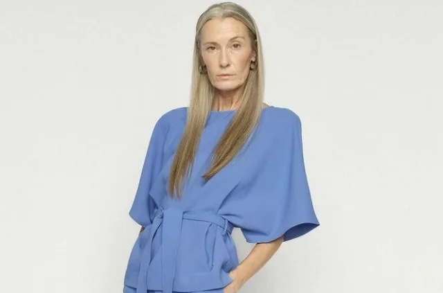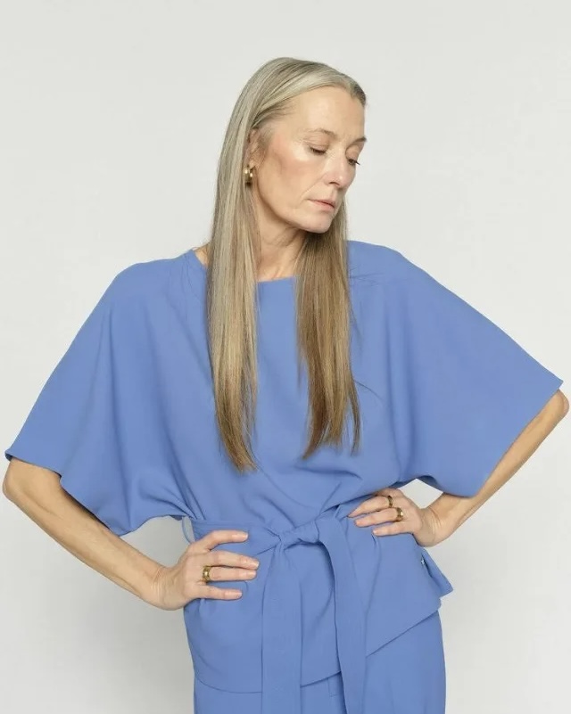 This blouse sits beautifully over the above mentioned trousers – in black or navy. Belt detachable.